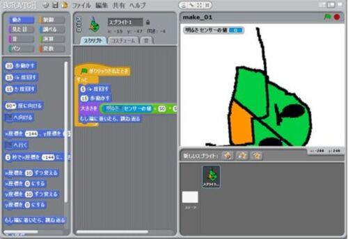 子供用プログラミング言語スクラッチを使ってみる。操作方法は直感的でわかりやすい。任意の物体を置いて、それをどう動かすかをプログラミングするのが基本。
